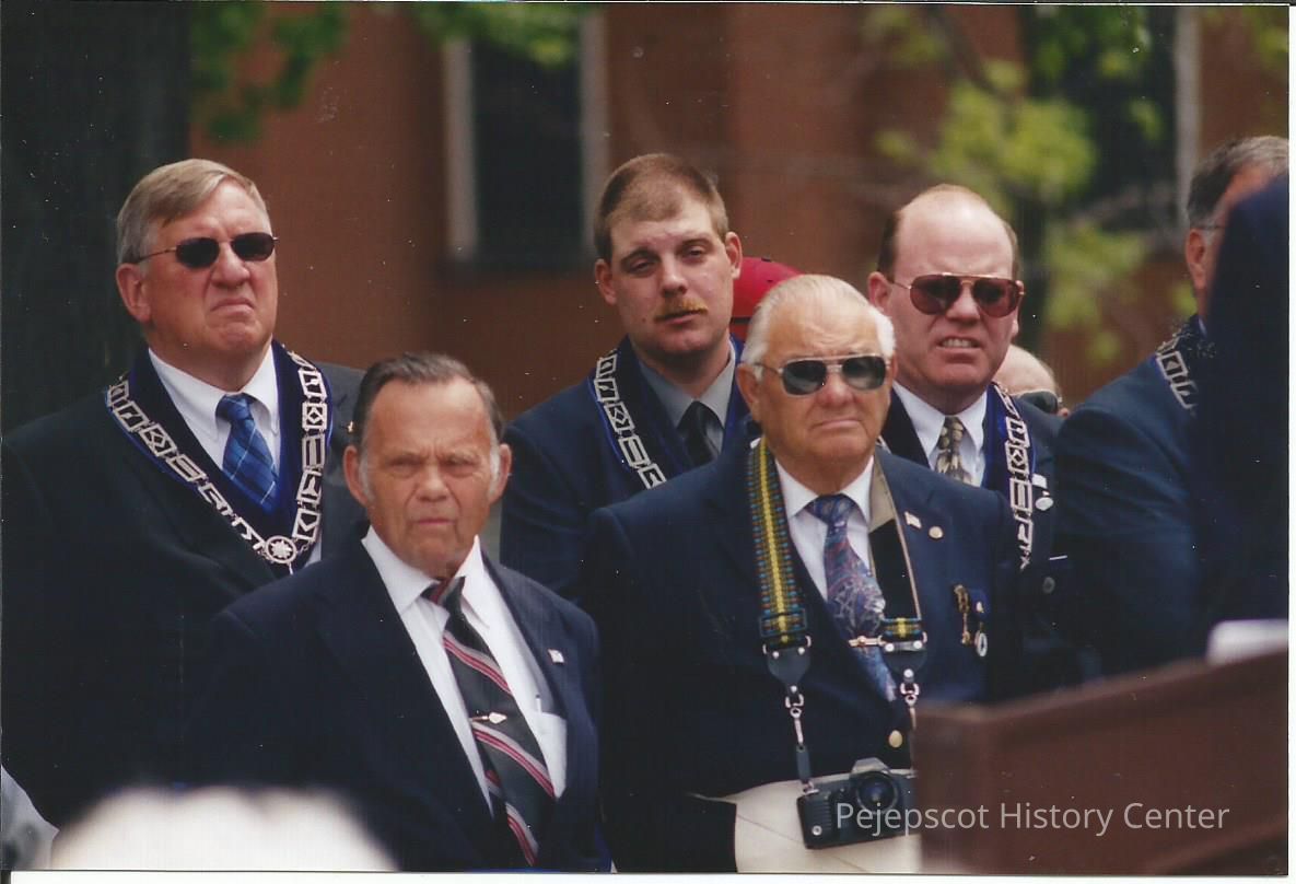 A color photograph of a group of men at the Chamberlain Statue dedication in Brunswick, ME. The man on the far left is Ashley Badger, NASB employee, the rest are unknown. Dated 05/31/2003.