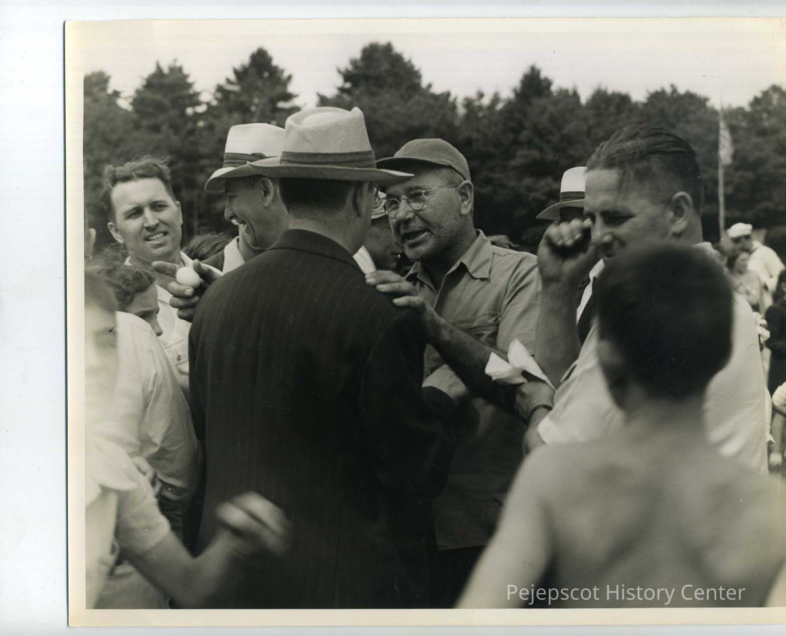 A group of men talking at the Verney Mill picnic at Thomas Point Beach. Undated