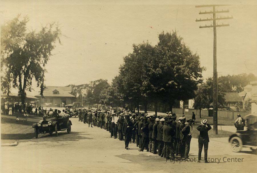 A B/W photograph of men lined up at the Brunswick railroad station.