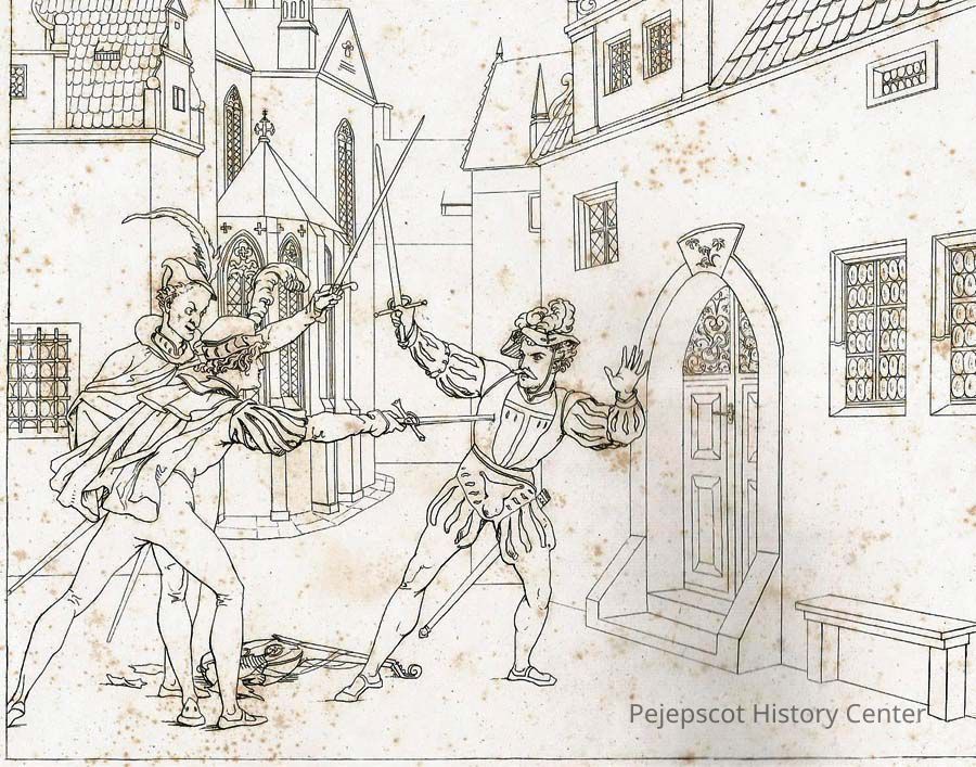 A B/W engraving of a man being stabbed with a sword. Illustration seems to depict a Renaissance-era story.