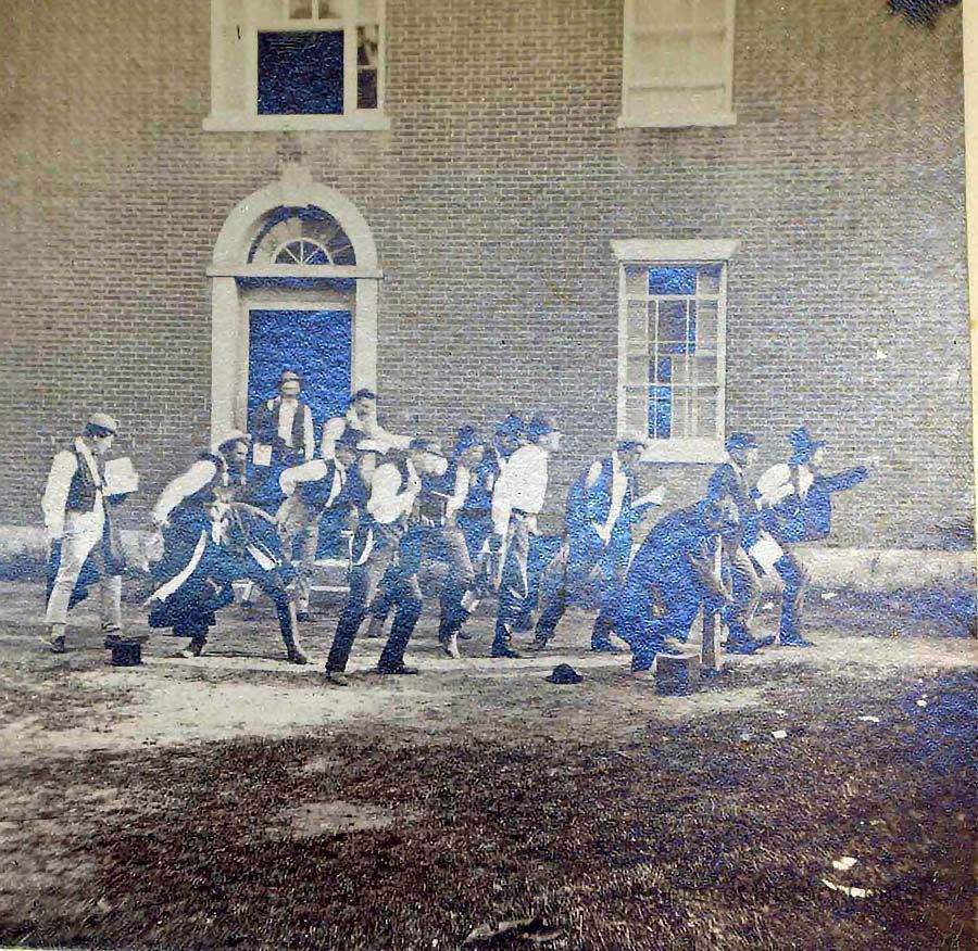 A B/W photograph of a group of men in costume outside the Hawthorne School. Undated.