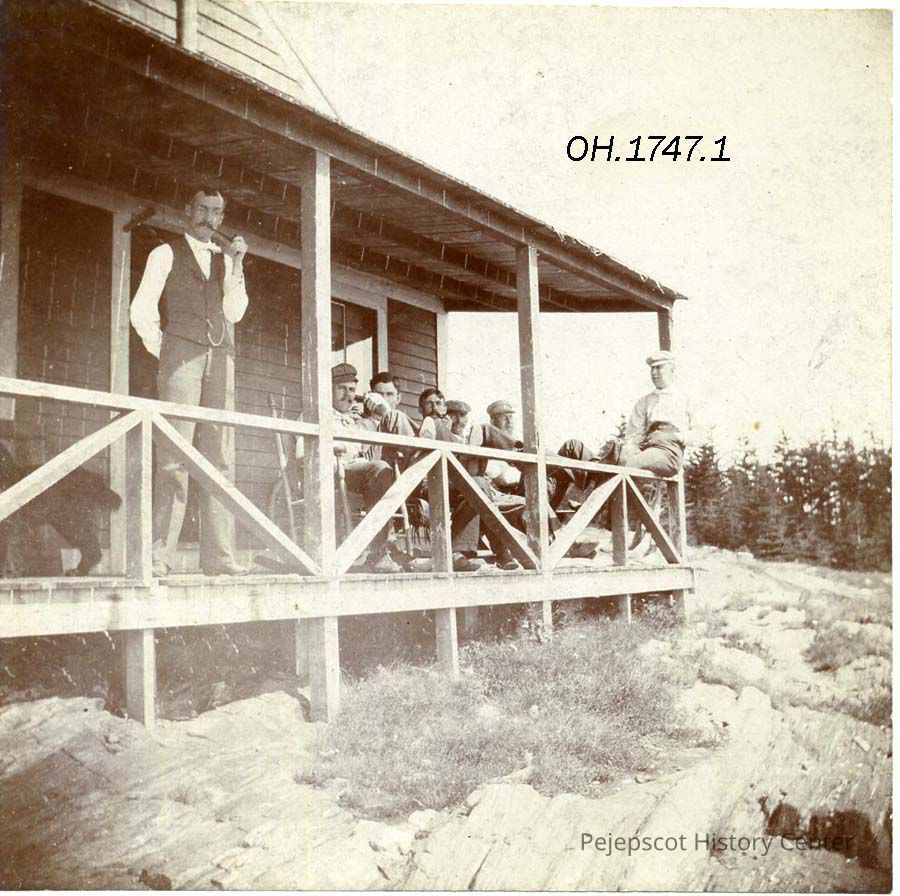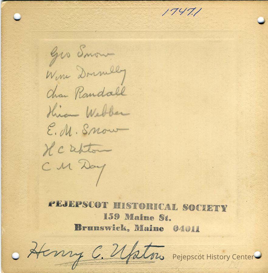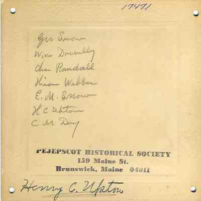 A B/W sepia photograph of seven men on a porch. Their names are written on the back - Geo. Snow, Wm. Donnelly, Chas. Randall, ? Webber, E.M. Snow, ?, C. M. Day. Not dated.