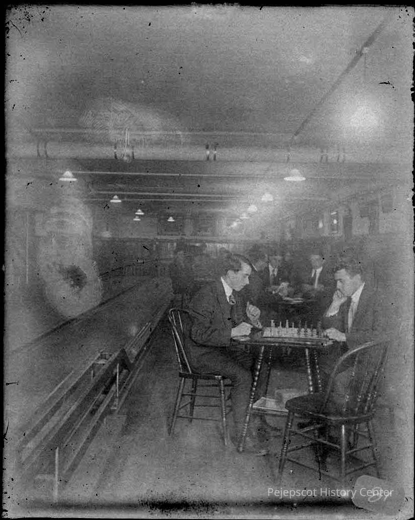 A negative view of some men playing chess in a bowling alley (lanes on the left side of the image).