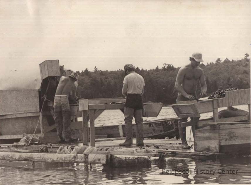 A B/W photographic view of men sorting mussels. This photo was published 8/22/1983.