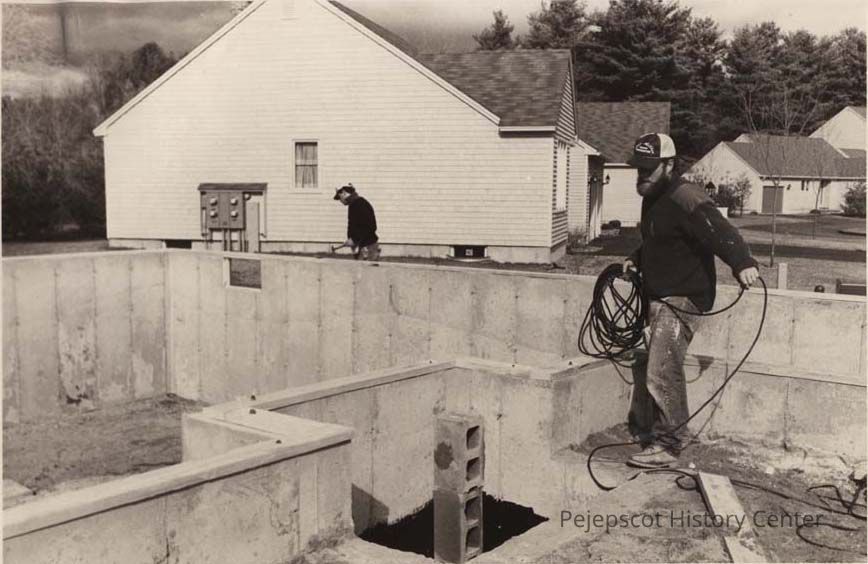 An undated black and white photo of construction at Mere Brook Condominiums in Brunswick, Maine. The condos were built in 1982.