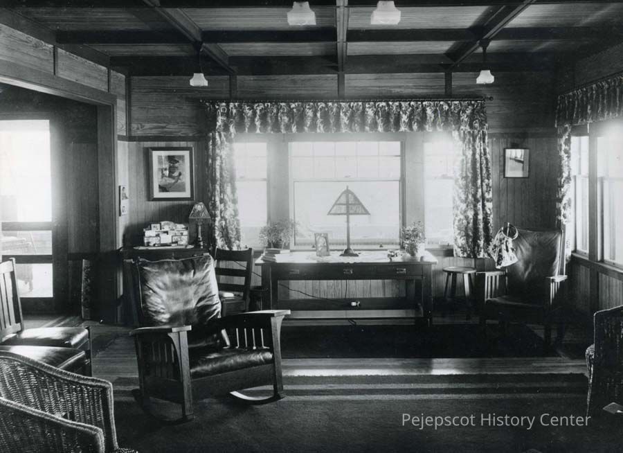 An undated black and white photograph of the living room of Professor George T. Files' cottage at Mere Point.Lexicon