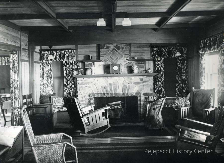 An undated black and white photograph of the living room of the Mere Point cottage of Professor George T. Files.Lexicon