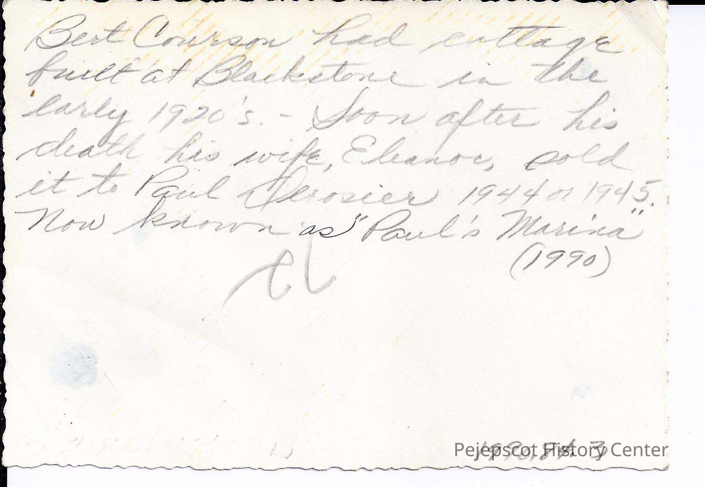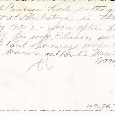 A b/w photograph of a cottage on Mere Point Road, Brunswick, ME. Back is inscribed "Bert Courson had cottage built at Blackstone in the early 1920s. Soon after his death his wife, Eleanor, sold it to Paul Derosier 1944 or 1945. Now known as 'Paul's Marina' (1990)". Dated 1937.Collection