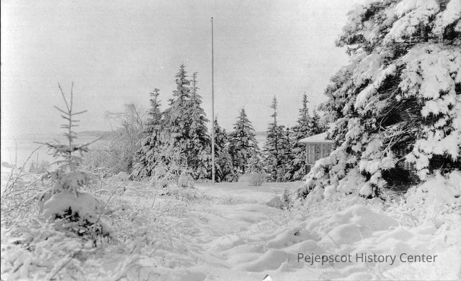 A B/W picture postcard view of Mere Point Road, Brunswick, ME after a winter storm. Undated.