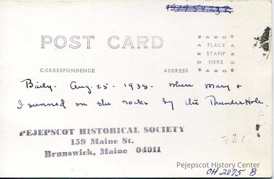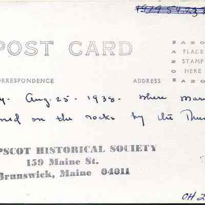 A color picture postcard of the Western Shore and Bath House at Mere Point, Brunswick, ME. Not dated.