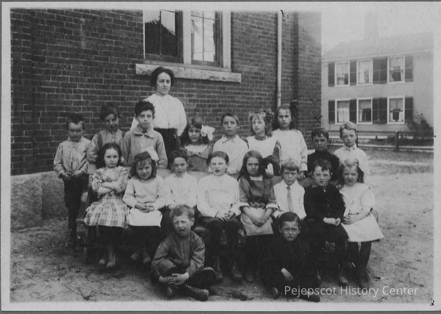 A B/W photograph of children at the Center Street School. The "X" is over Merle Walker's head. The house in the background is no longer there and the school burned. The Brunswick Recreation Center was built on the site. Undated