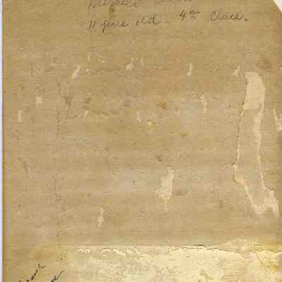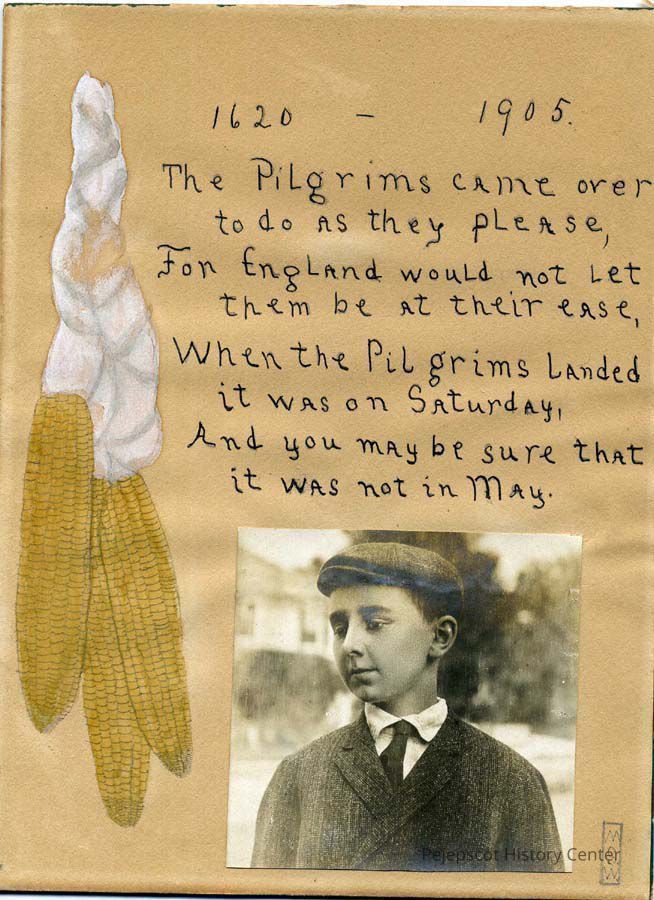 B/W class photo of Merrill Willis, 11 years old, 4th class, with poem about Pilgrims.