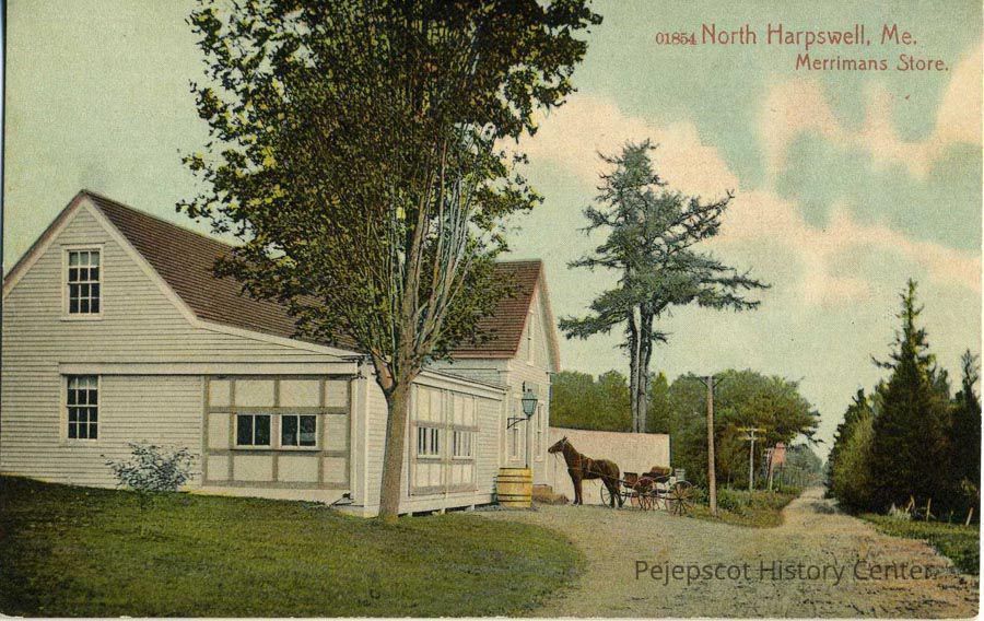 A colored postcard picture of Merriman's Store in North Harpswell, with a horse and cart in front.Collection