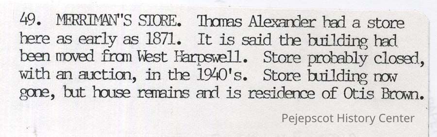 A color print copy of Merriman's Store, North Harpswell, on the road to Brunswick. Thomas Alexander had a store here as early as 1871. See back of photo for more info. UndatedCollection