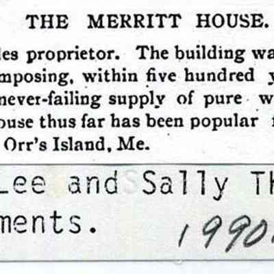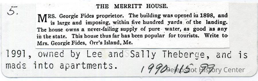 A color print copy of the Merritt House. The building was opened in 1898. See back of photo for more info. Undated