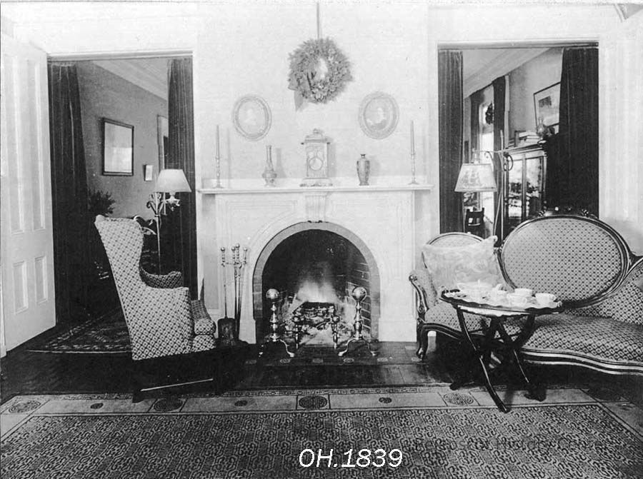 A B/W photograph of Mrs. Gilbert Elliott's parlor in the Merryman-Elliott house, corner of Maine and Pleasant Streets, Brunswick, ME.