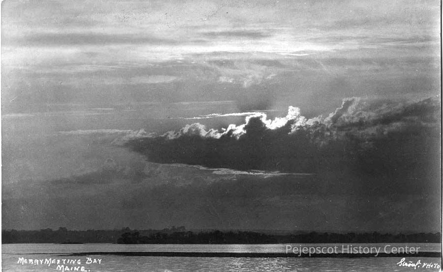 A B/W picture postcard view of clouds moving in over Merrymeeting Bay, Brunswick, ME. Undated.