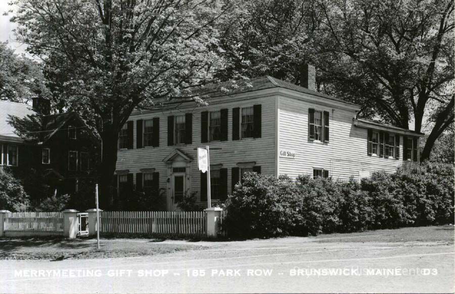 An undated black and white postcard shows the Merrymeeting Gift Shop at 185 Park Row, Brunswick, Maine.Collection