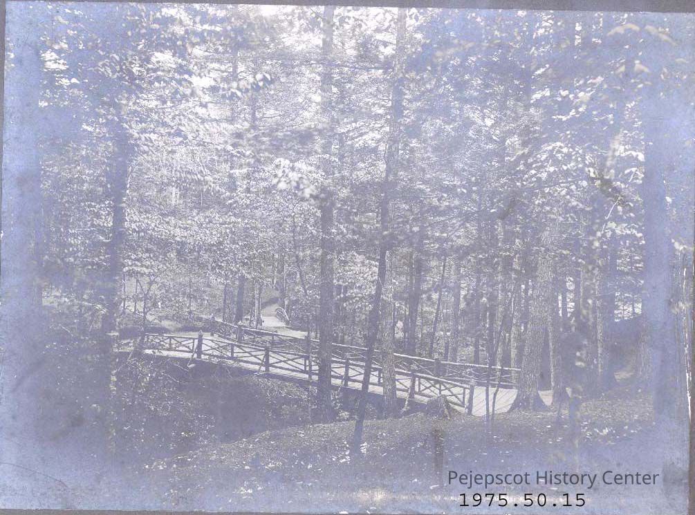 A B/W photograph of the paths and bridge at Merrymeeting Park in Brunswick, ME. Undated.