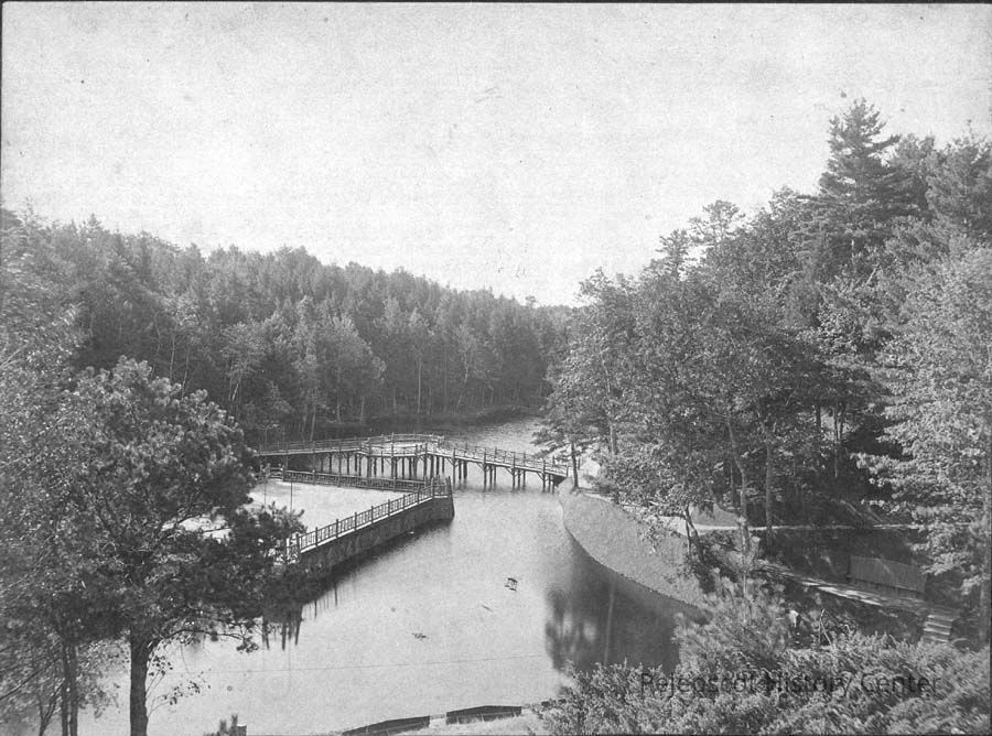 A B/W photograph view of Merrymeeting Park in Brunswick, ME. The rustic bridge and island dance floor are visible. Dated early 1910's.