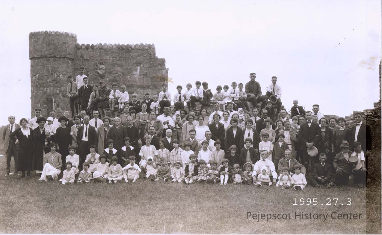 B/W photo of a gathering Franco-American at Merrymeeting Park, standing in front of the casino entrance after the rest of the building was gone. No date.