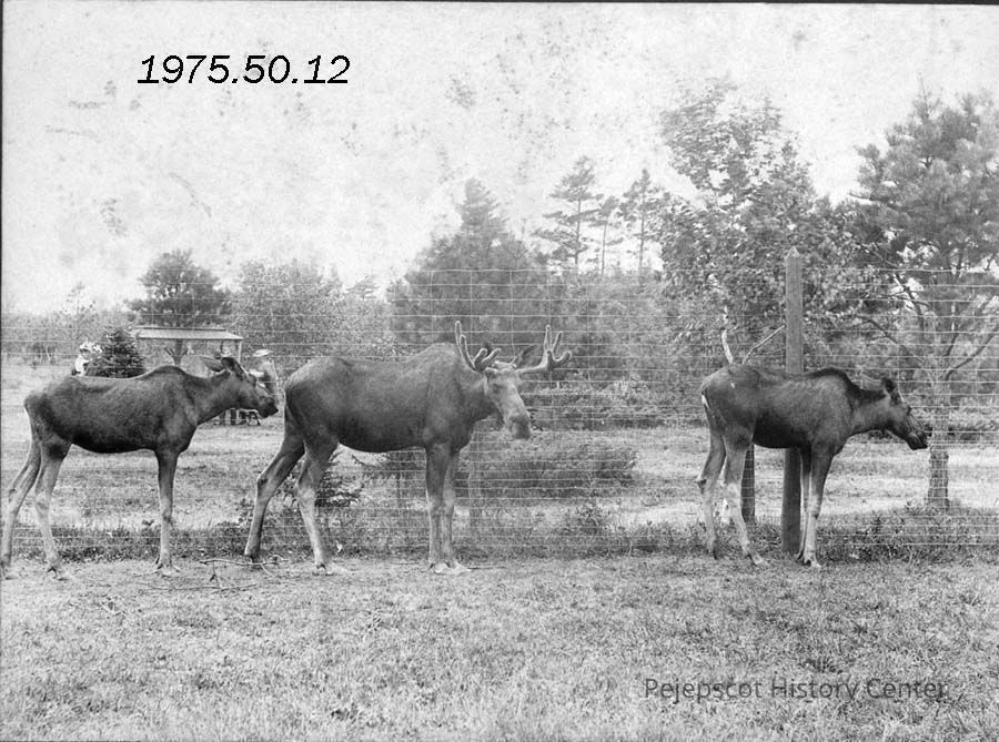 A black and white photograph of moose in the zoo at Merrymeeting Park, an amusement park in Brunswick, ME. Dated ca. 1900.