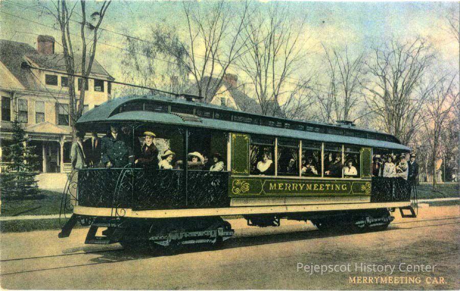 An undated color postcard shows the Merrymeeting trolley car in Brunswick, Maine.
