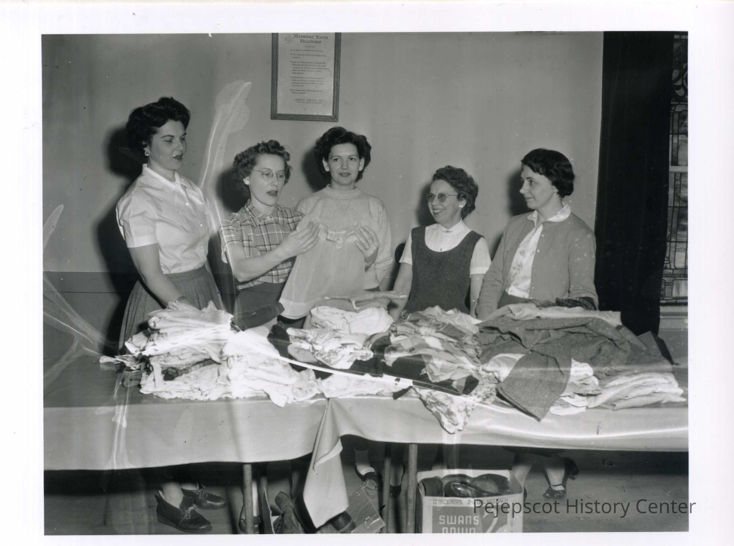 B/W photo of six (6) members of the Methodist Youth Fellowship sorting thru clothes preparing things for a rummage sale.