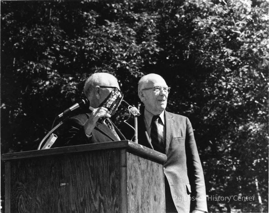 Photo of Maj. Gen. Leigh Wade (left) and Mr. Paul Burbank (right) speaking at the commemoration of the 50th anniversary of the "Around the World Flyers" at Monument Rock, Mere Point ,Brunswick, Maine, 1974.Lexicon