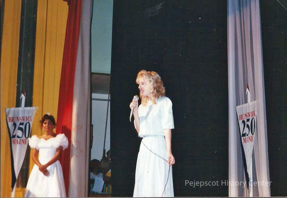 A color photograph of Michelle Bergquist singing "Through he Eyes of Love" from Ice Castles