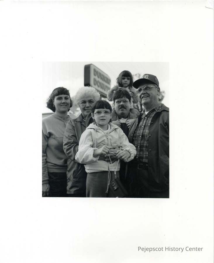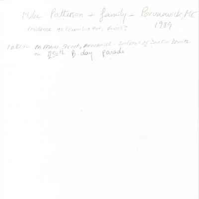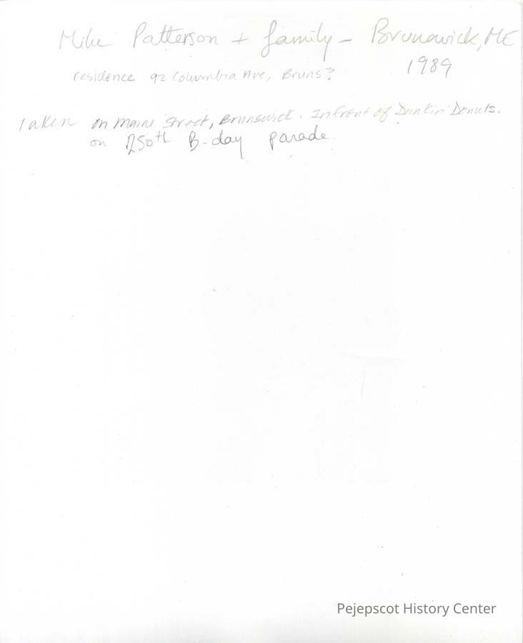 A black and white photograph of Mike Patterson and his family, residents of 92 Columbia Avenue (?), Brunswick, Maine. The photograph was taken on Maine Street, Brunswick, in front of Dunkin Donuts during Brunswick's 250th Birthday Parade.