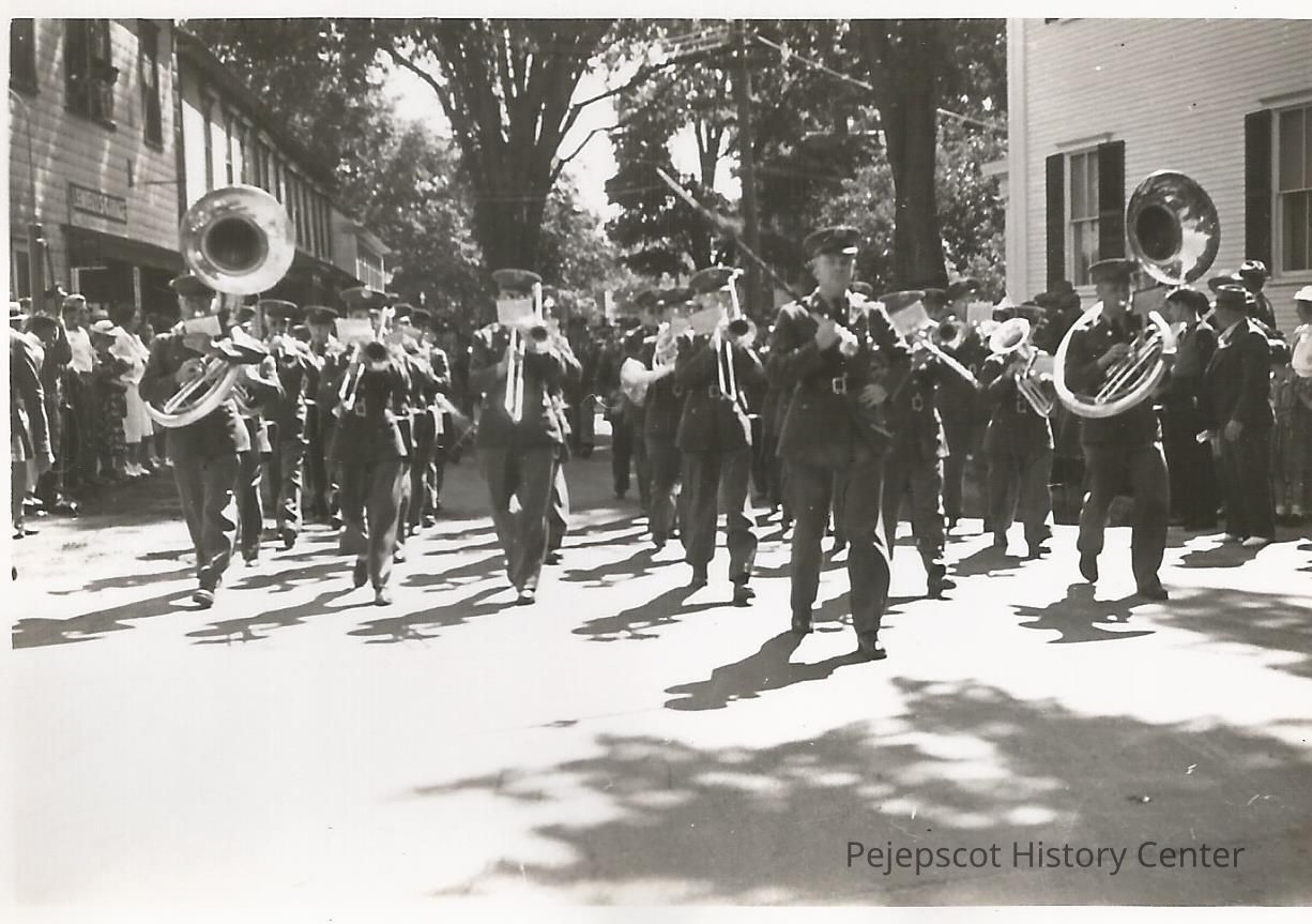 A B/W photo of a military marching band in Brunswick's 200th Anniversary parade. Undated