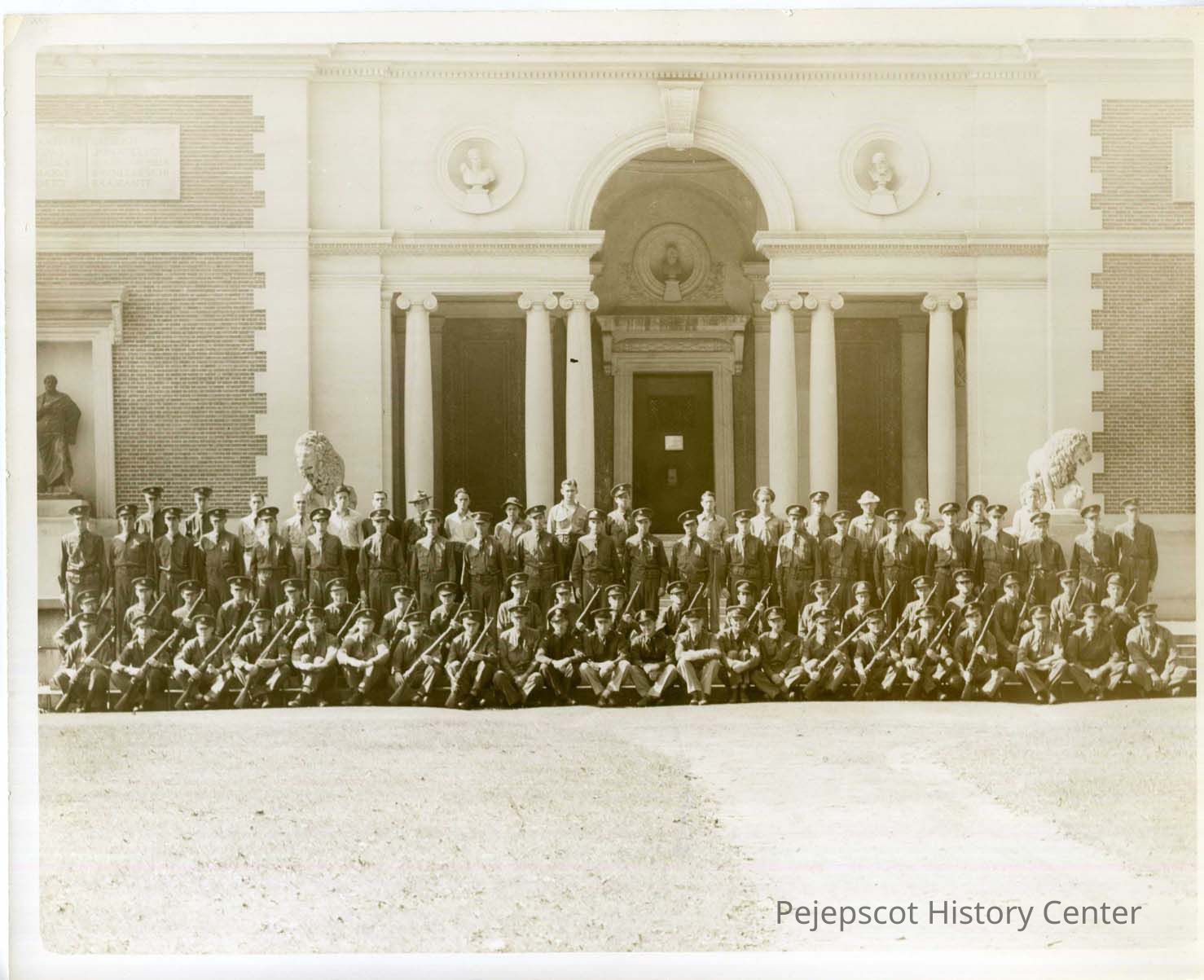 A photo of a military unit taken in front of the Walker Art musuem. The first two rows of soldiers hold guns and sit on the steps. The back two rows are standing.