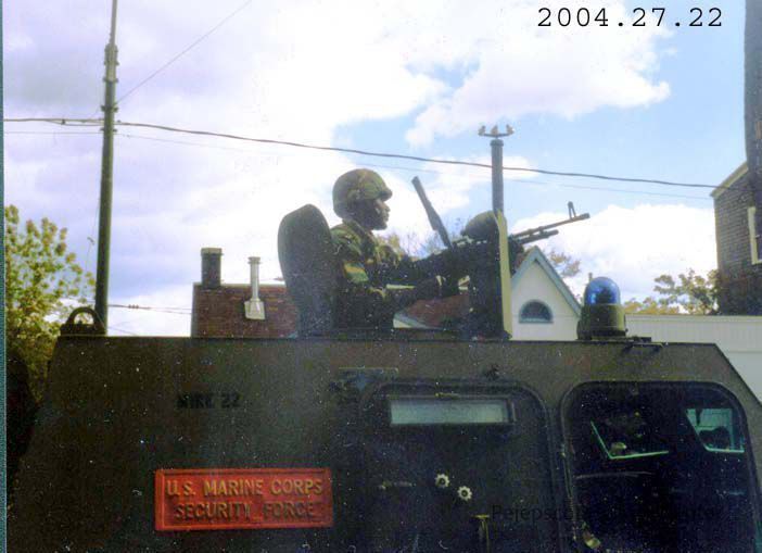 A color photograph of Brunswick's 250th Anniversary Parade (Oct 1989) showing a Marine riding in a military vehicle, manning a machine gun.