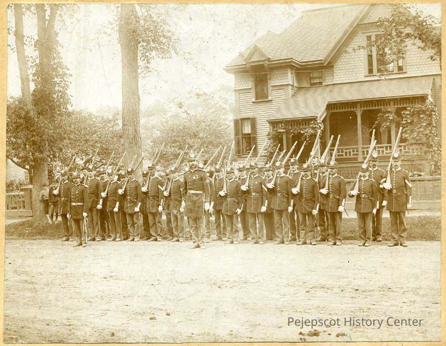 A B/W photo of a militia company in front of 46 Pleasant Street, Brunswick. Dated June 25, 1894.