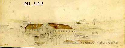 Drawing of a mill with brown roofs. Written on the front, "Mills in cove - date unknown - donor unknown".