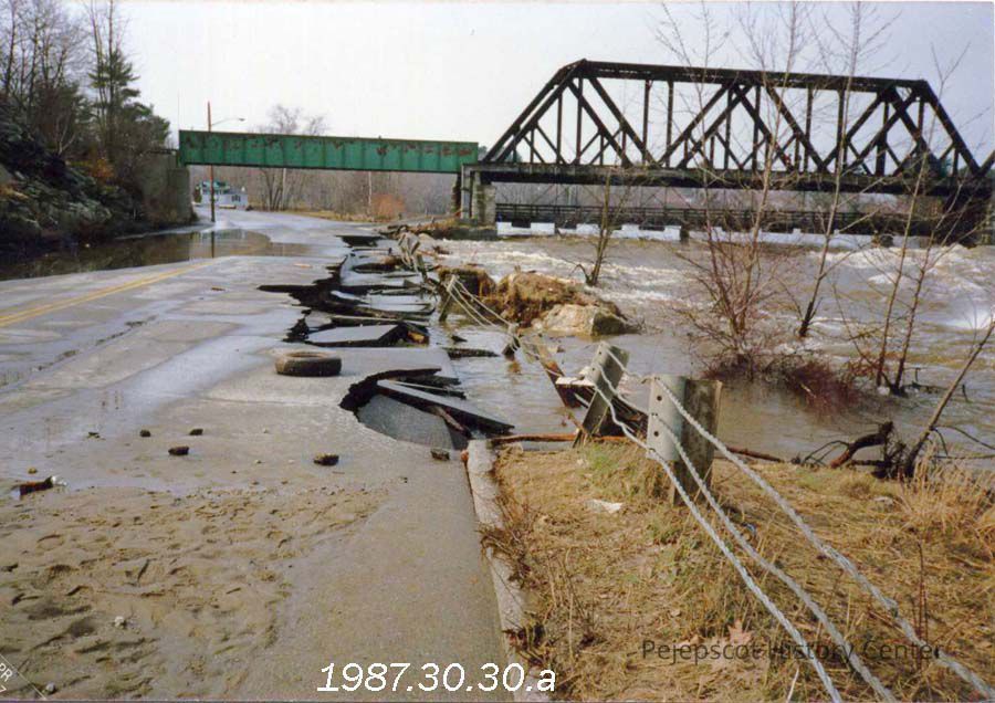A color photograph of Mill Street, Brunswick, Maine washed away. The Black Bridge can be seen in the back ground. Photo taken April 3, 1987