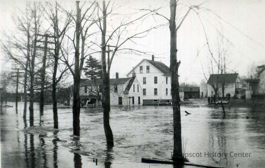 A black and white photograph of Mill Street during the 1936 flood.