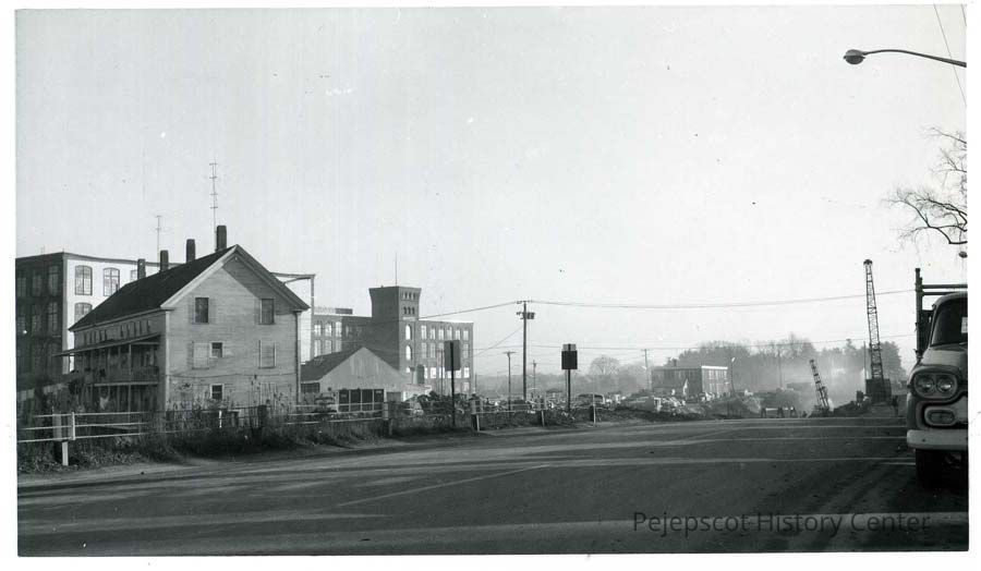 B/W photo of Mill Street looking toward Maine Street after the construction of the Route 1 bypass.
