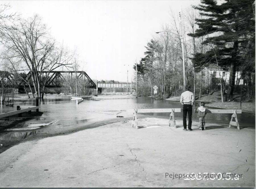 A B/W photograph of Mill Street with the Black Bridge in the background, April 2, 1987, 6 AM. Brunswick, Maine.