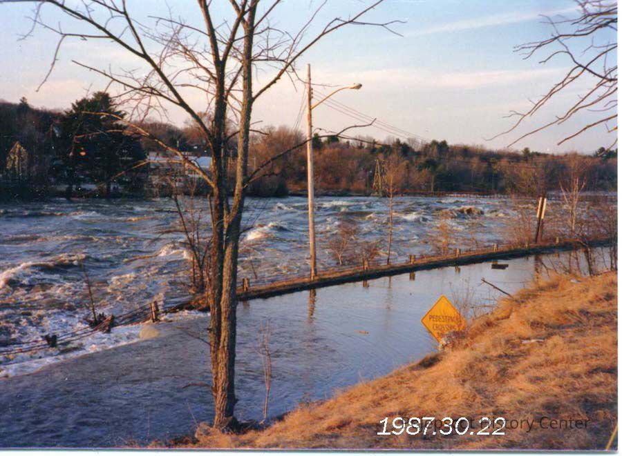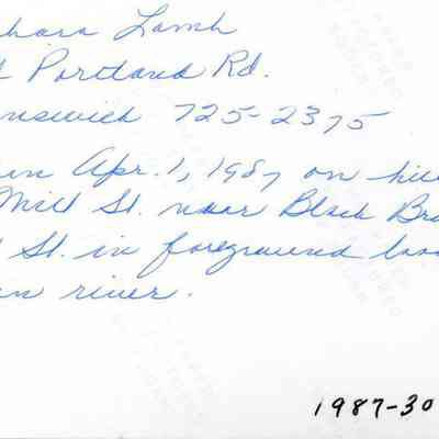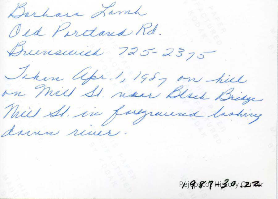 A color photograph of Mill Street, Brunswick, Maine. Flood of 4/2/1987.