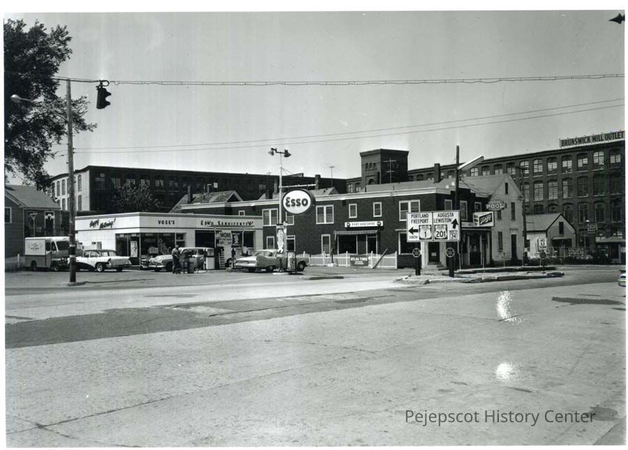Pictured is he neighborhood of Mill and Maine Streets before the neighborhood was razed to build the Route One by-pass. This construction destroyed the nucleus of the Franco-American community in Brunswick.