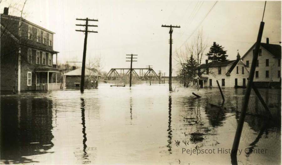 A B/W photo of Mill Street looking downstream towards the Black Bridge, in the 1936 flood. Undated