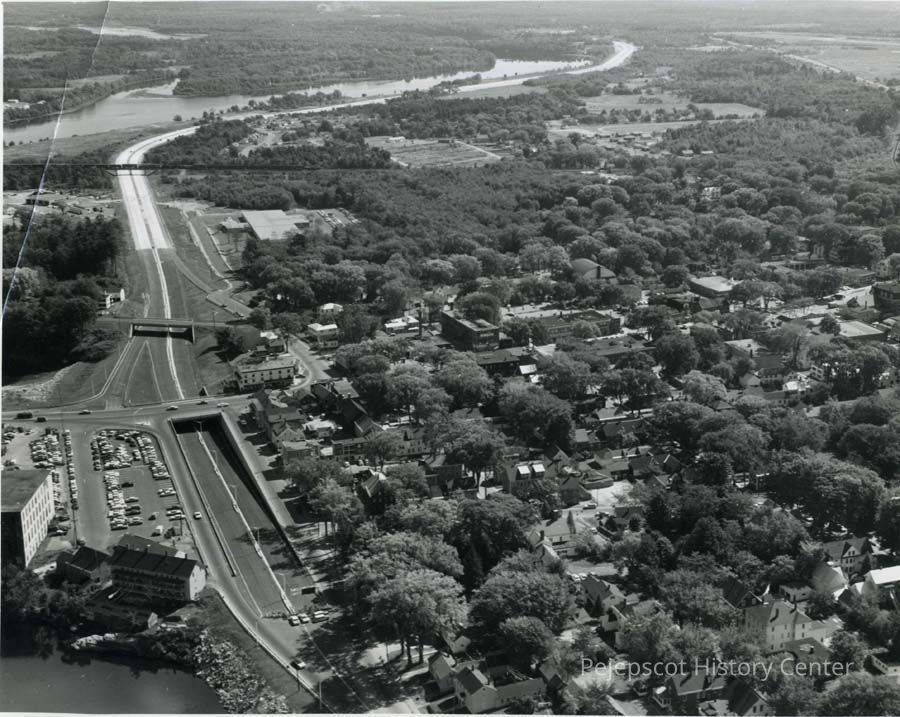 A B/W aerial view photograph of the Mill Street underpass under construction. View of Mill Street, Brunswick, ME. Dated 1962.