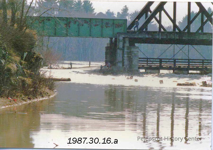 A color photograph taken from Mill St. looking at washed out road and the Black Bridge damage. Brunswick, Maine. April 2 1987