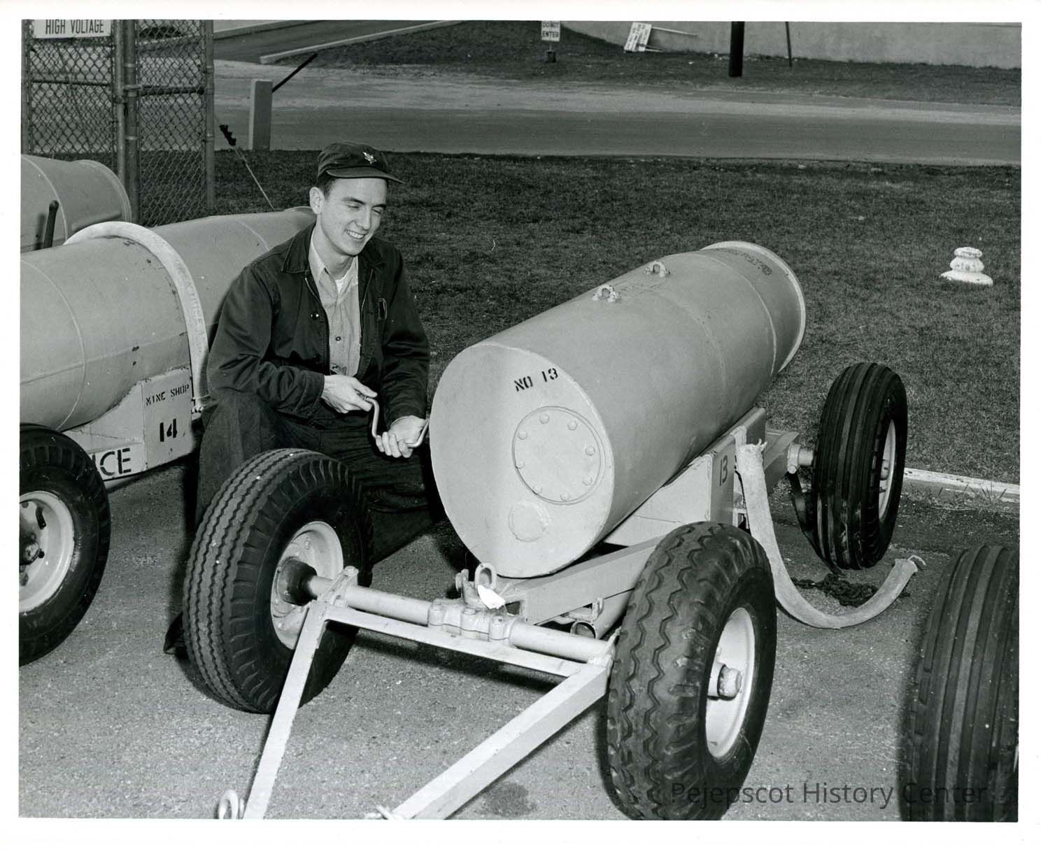 Robert A. Daley, Mineman Second Class, USN works in the mine shop at BNAS. He is working on a piece of equipment on a trailer stamped "13" with another piece behind him stamped "14." The photo is stamped with "U.S. NAVAL AIR STATION BRUNSWICK, MAINE" and " OFFICIAL U.S. NAVY PHOTOGRAPH NOT FOR PUBLICATION UNLESS OFFICIALLY RELEASED." UndatedCollection