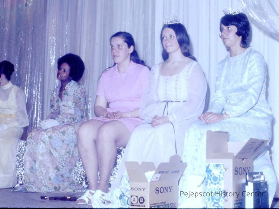 A 35 mm color slide of Gale Cowley and Diana Johnson, contestants in the 1973 Miss Teen Queen Pageant. Barbara Theberge, Sharon Hinckley and Doris Bernier, former pageant winners, are seated to their right. The slide is marked, "1." UndatedCollection