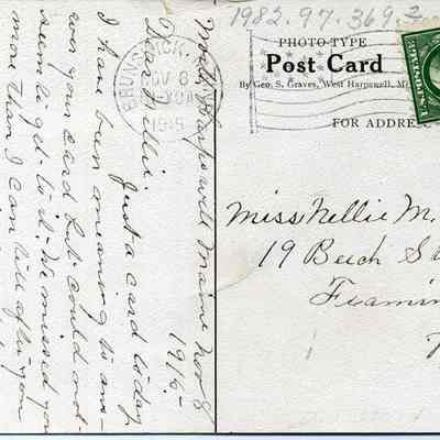 B/W postcard of Monument Rock in Casco Bay. Postcard to Miss Nellie M. Pennell, 19 Beech Street, Framingham, Mass. from her aunt, Augusta. Postmarked Brunswick, November 8, 1915.Collection