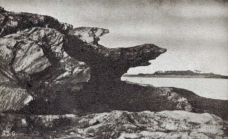 An undatedB/W photograph of Monument Rock, looking towards Eagle Island. Harpswell, ME