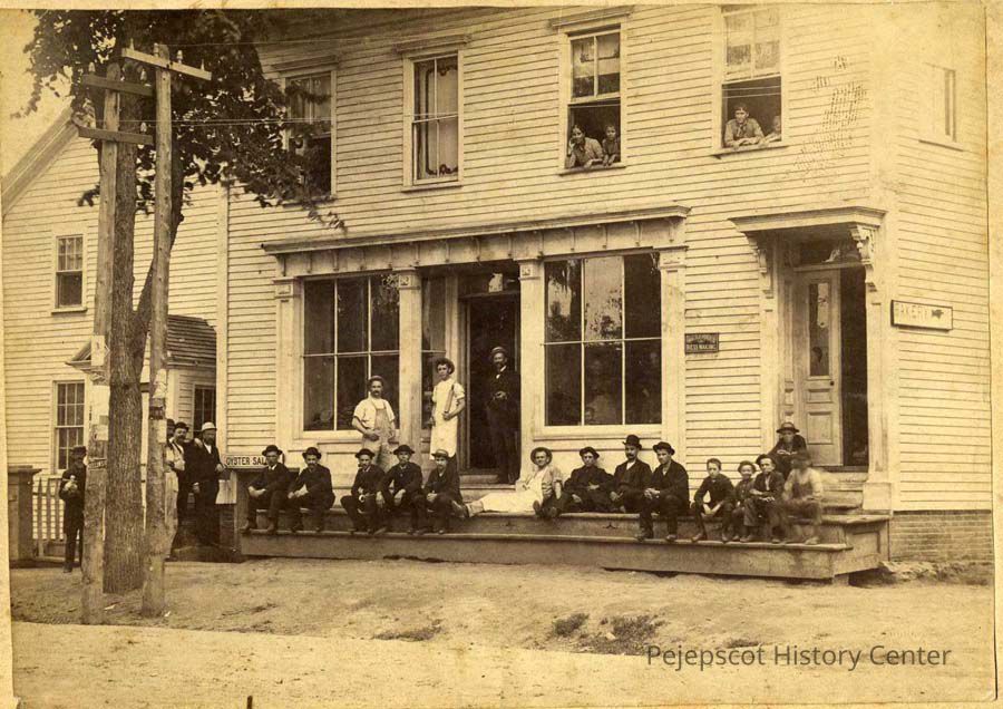 A sepia toned photograph of many unidentified people gathered outside of Morin's Store, at 18 Mill Street.